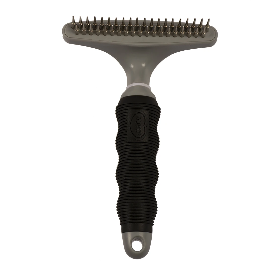 Deze duvoplus uitdunhark is geschikt om losse haren uit de ondervacht te verwijderen en een ideaal werkmiddel tijdens de rui. Maak de vacht van jouw hond mooi en gezond door de dode haren en onderwol uit te kammen. Deze kam is uiterst geschikt tijdens de ruiperiode bij honden met veel of een dikke ondervacht. Gebruik deze hark om de 3 maanden.