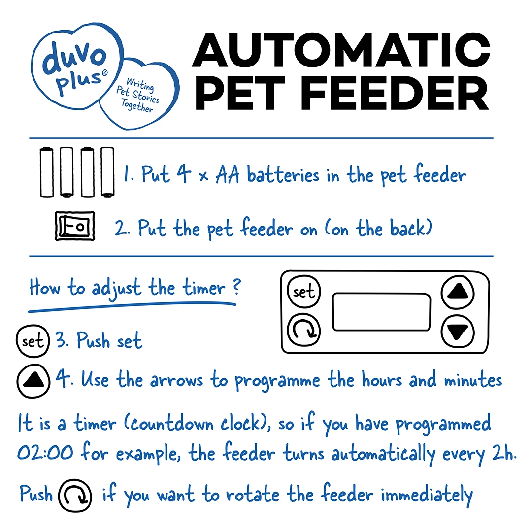 Met deze automatische eetkom van duvoplus kan je je huisdier eten geven volgens de tijd en hoeveelheid die je vooraf hebt ingesteld. Je kan tot 5 maaltijden per dag programmeren. De voerautomaat is heel gebruiksvriendelijk en in geen tijd ingesteld. Het is geschikt voor katten of kleine & medium honden en kan met nat- en droogvoer of snacks worden gevuld. Door het stevig deksel is het voer zeer goed beschermd tegen niejesgierige dieren. De automaat is gemaakt uit duurzame kunststof en is daardoor gemakkelijk schoon te maken. Zeer geschikt voor baasjes die overdag niet veel thuis zijn en gespreide maaltijden aan hun geliefde dier willen geven.