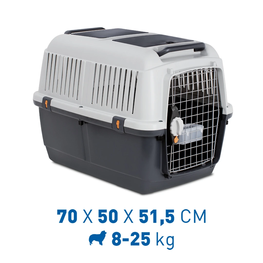 Met deze transportbox van duvoplus ‘Buddies on the gooo’ neem je jouw buddie overal mee naartoe. Handig voor zowel korte trips als voor lange reizen met de wagen of zelf met het vliegtuig, want de Bracco is IATA gekeurd en voldoet dus aan de strenge eisen om uw dier met eender welk vervoermiddel veilig te transporteren. De box is robuust en heeft een ruime metalen deur met extra stevige en eenvoudig te openen sloten. De zijkanten zijn voorzien van ventilatie gaten, zodat uw huisdier altijd voldoende lucht krijgt. Bovenaan zijn er 2 stevige handvaten voor het ultieme gebruikersgemak van eigenaren van gezelschapsdieren. Het deksel kan van de onderzijde gescheiden worden, zodat de box gemakkelijk schoon gemaakt kan worden. Inclusief drink- en voerbak. Voor honden van 8 tot 25 kg.