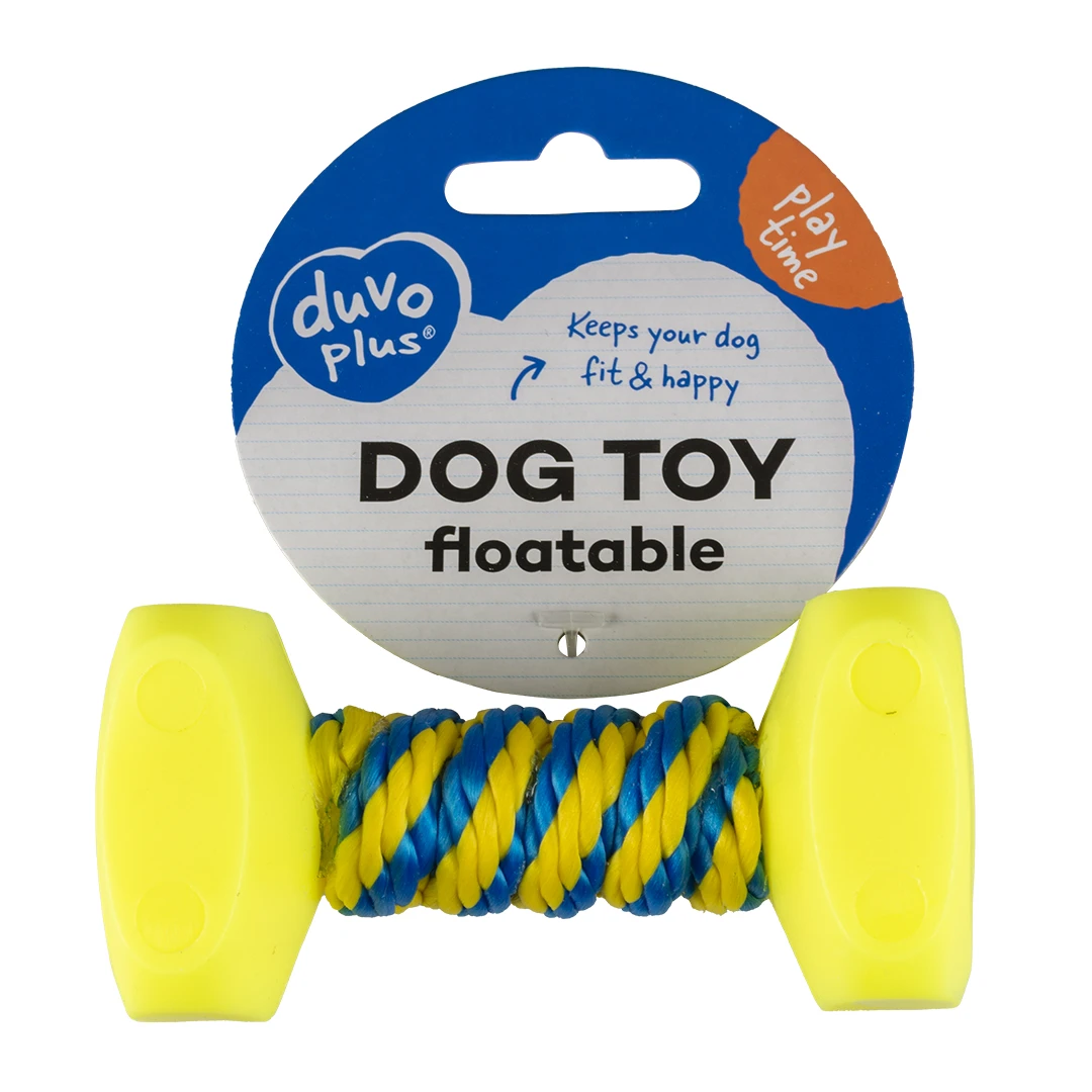 Dit duurzaam kauwspeeltje van duvoplus is gemaakt uit sterk en drijfbaar materiaal. Rond de halter is er ook touw bevestigd, dit maakt het aangenaam om aan te kauwen en het ondersteunt de tandverzorging. Versterk de band met je hond door samen te ravotten.