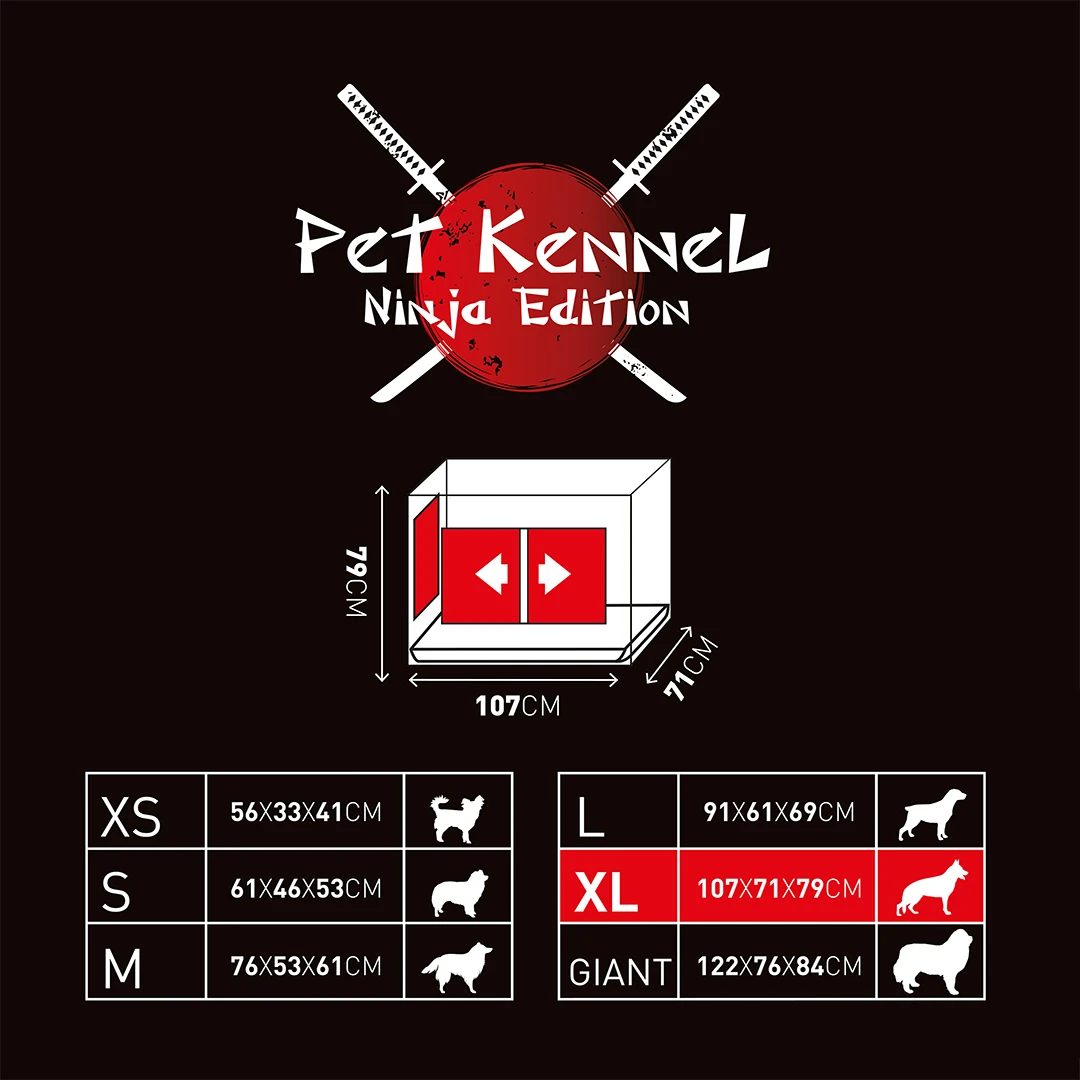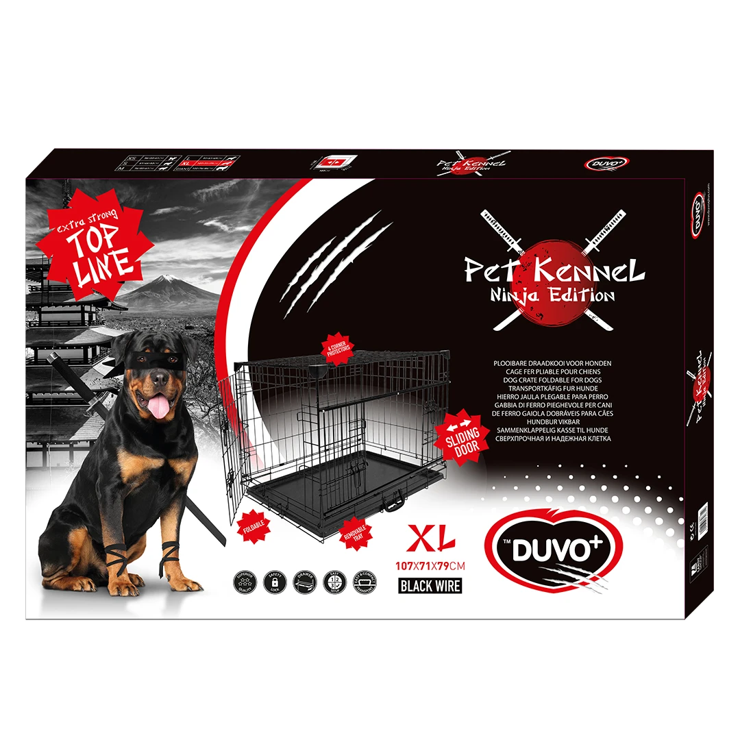 Deze ‘Limited Ninja Edition’ draadkooi van duvoplus is niet voor doetjes. De 4 hoekbeschermers en de dikkere draad maken deze draadkooi heel robust en inzetbaar voor alle hondenrassen. Heel handig in gebruik, want naast een gewone deur op de korte zijde, is er een gepatenteerd schuifdeur-systeem waardoor de bench ook in kleine ruimtes of bij transport in de wagen kan worden gebruikt. Makkelijk inklapbaar, met draadhandvat en plastic lade.