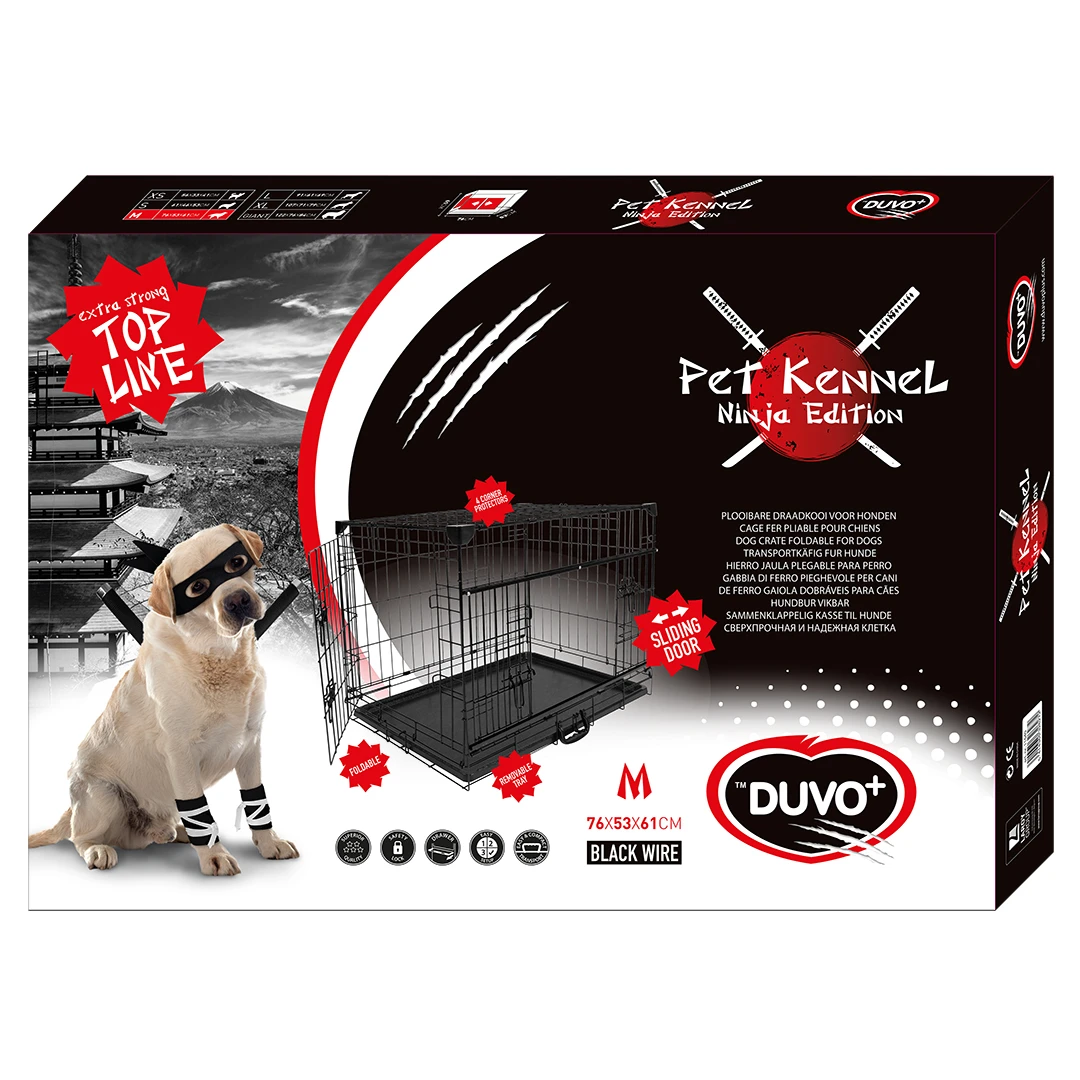 Deze ‘Limited Ninja Edition’ draadkooi van duvoplus is niet voor doetjes. De 4 hoekbeschermers en de dikkere draad maken deze draadkooi heel robust en inzetbaar voor alle hondenrassen. Heel handig in gebruik, want naast een gewone deur op de korte zijde, is er een gepatenteerd schuifdeur-systeem waardoor de bench ook in kleine ruimtes of bij transport in de wagen kan worden gebruikt. Makkelijk inklapbaar, met draadhandvat en plastic lade.