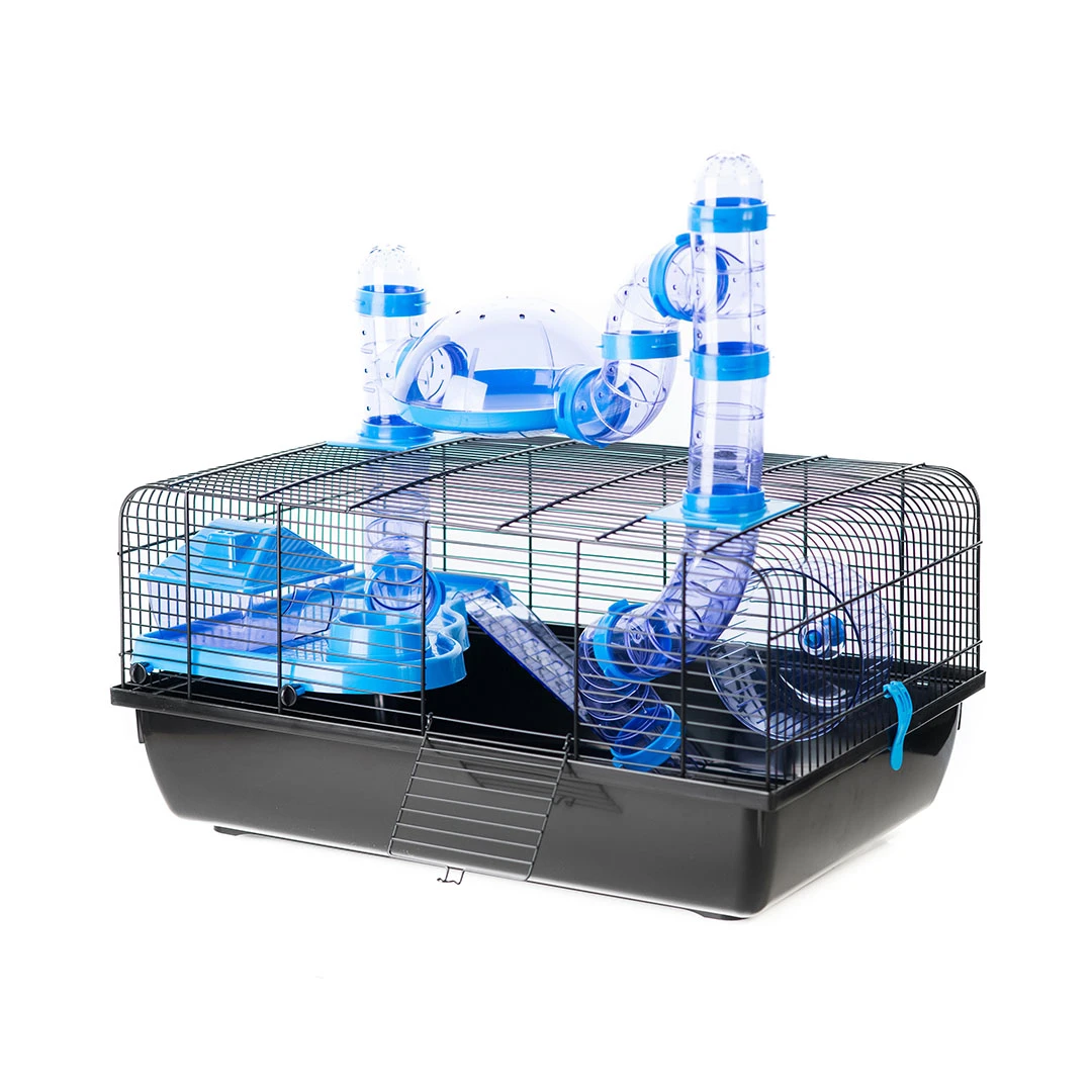 Deze Jerry kooi met panorama van duvoplus is een kwalitatieve kooi met inclusief loopradje en trapje. De ideale behuizing voor uw hamster. Deze kooi heeft extra tunnels die uit de kooi komen en een koepel waar uw hamster kan genieten van een 360graden panorama. De bovenkant is afneembaar waardoor u te kooi gemakkelijk kan kuisen.