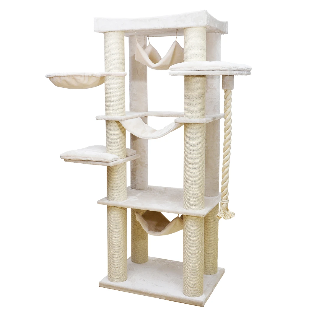 De EBI krabpaal Cambridge is een pluche krabpaal van maar liefst 197 cm hoog dat staat als een huis. Zijn brede opstelling, bestaande uit 4 krabstammen met een diameter van 15 cm, maakt het geheel super stabiel. In de vier hangmatten kan je kat heerlijk uitrusten. Deze krabpaal is geschikt voor grote en actieve katten of gezinnen met meerdere katten. Het extra dikke speeltouw maakt de paal compleet.