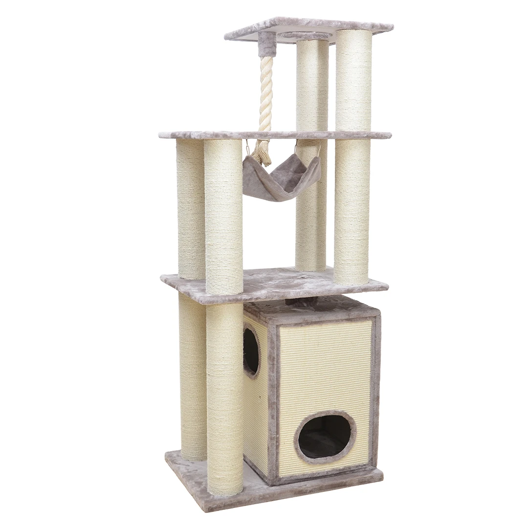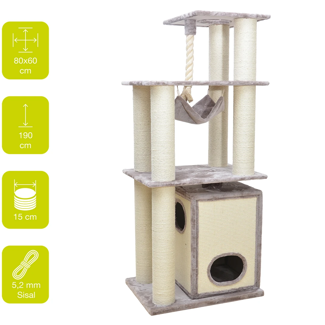 De EBI krabpaal Swindon is een pluche krabpaal van 190 cm hoog dat staat als een huis. Zijn brede opstelling, bestaande uit brede krabstammen van maar liefst 15 cm dik, maakt het geheel super stabiel. De krabpaal heeft alles wat een kattenhart begeert: een stevige ondergrond, brede sisal palen, een comfortabel schuilhuisje bestaande uit 2 verdiepen, een hoge hangmat, een hoge ligmand en een extra dik speeltouw. Deze krabpaal is geschikt voor grote en actieve katten of gezinnen met meerdere katten.
