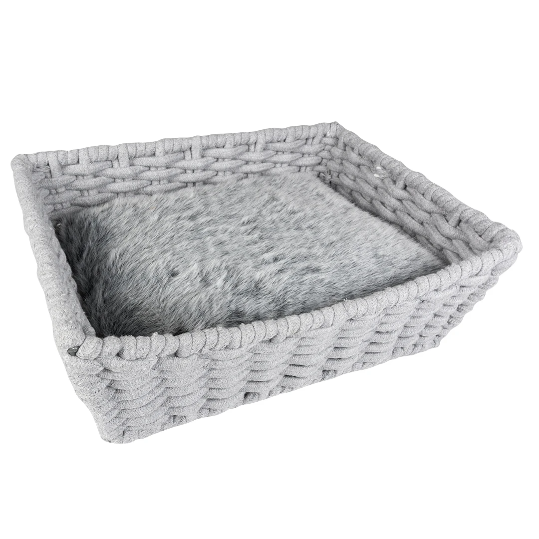 Deze stevige, grijze Siesta mand van duvoplus is een stijlvolle mand vervaardigd uit een metalen frame bekleed met kwalitatief katoen touw. Voor extra comfort en warmte is de mand voorzien van een warm kussen bekleed met linnen aan de ene kant en zachte long faux fur aan de andere kant. Het hedendaags design past perfect binnen elk interieur en het is de ideale plek voor jouw kat of kleine hond om in weg te dromen.