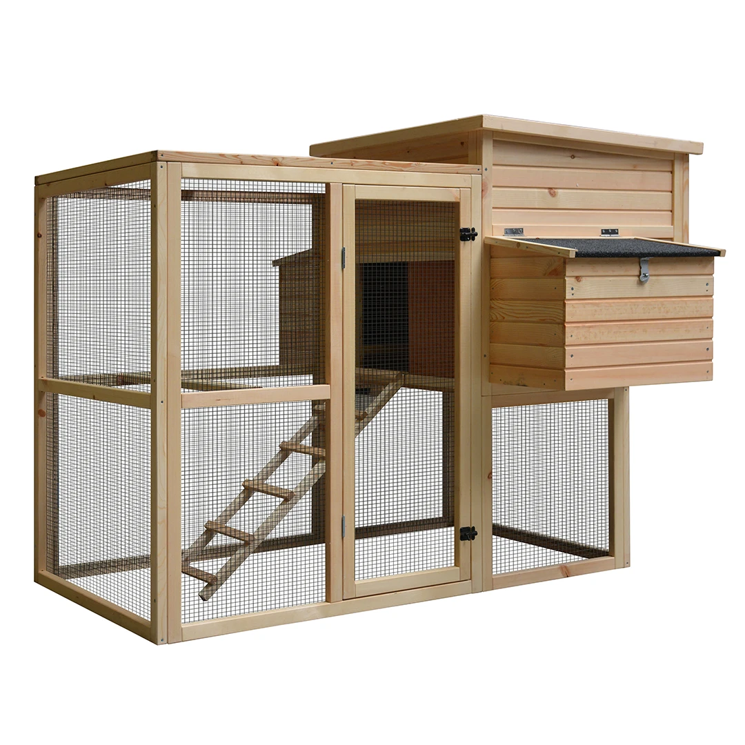 Het Woodland kippenhok Loft Attic Pinus van duvoplus is een zeer ruim en stevig kippenhok in naturelle kleurstelling. Dankzij de aantrekkelijke vormgeving spreekt dit hok een breed publiek aan. Het hok is voorzien van 2 verdiepingen. Onderaan is een ruime uitloopren die via een trap in verbinding staat met het hogergelegen mezannine met schuilhok dat uitgerust is met 4 legbakken en voldoende zitstokken. Het ruime hok is geschikt voor 4 tot 6 kippen en is voorzien van een metalen schuiflade en maar liefst 3 deuren. Zo kan u gemakkelijk het hok reinigen en de kippen eten en drinken geven. Het hok is al ??nmalig gebeitst maar wij adviseren u om dit periodiek te herhalen ter bevordering van de duurzaamheid.